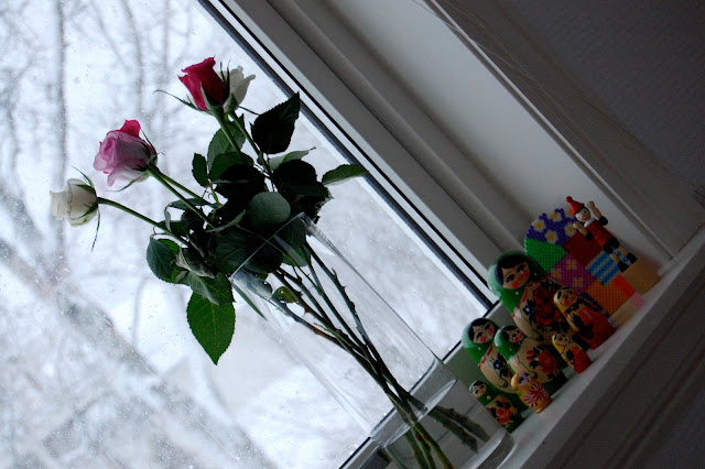 Og min lille samling i hjørnet. Roser fra søs og perlehjerte fra niese. Veldig fine saker.